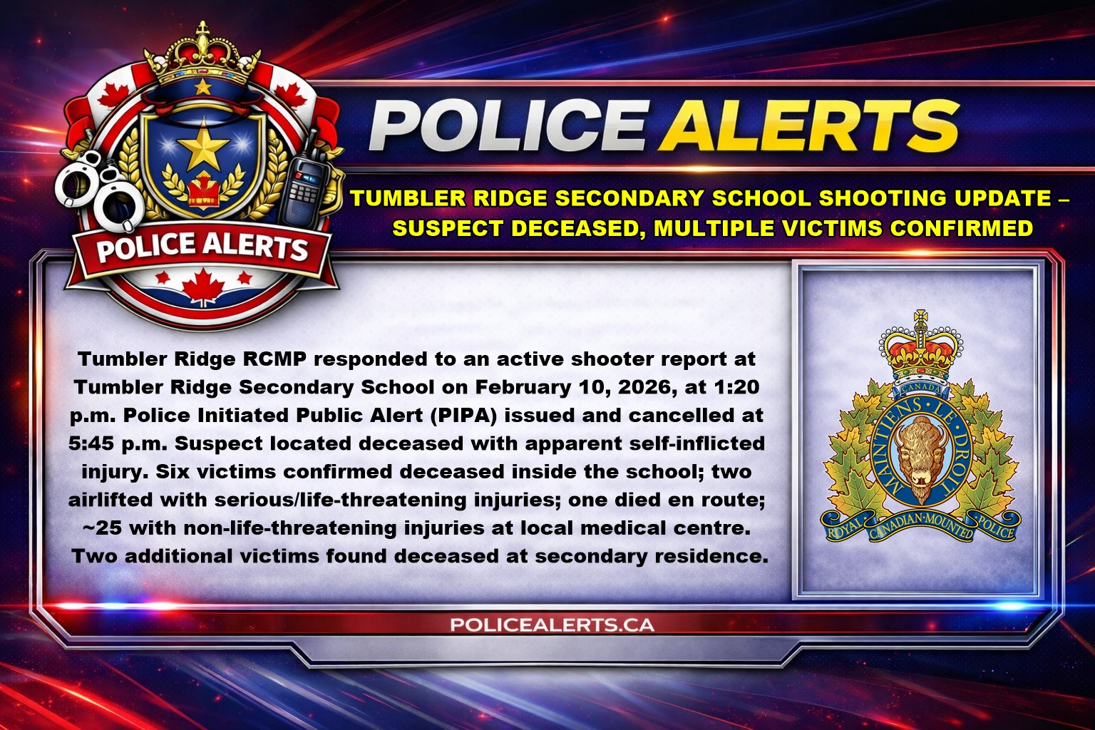 On February 10, 2026, at approximately 1:20 p.m., Tumbler Ridge RCMP received a report of an active shooter at Tumbler Ridge Secondary School. A Police Initiated Public Alert (PIPA) was issued as officers responded to the scene. The alert was officially cancelled at 5:45 p.m. as police do not believe there are any outstanding suspects or ongoing threat to the public.